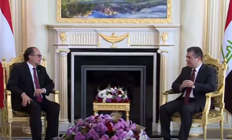 ئەلێکساندەر شالنبێرگ، وەزیری دەرەوەی نەمسا لەبارەی کۆبوونەوەی لەگەڵ سەرۆکوەزیرانی هەرێمی کوردستان رایگەیاند، لەگەڵ سەرۆکوەزیران مەسرور بارزانی، “باس لە پەرەپێدانی پەیوەندییەکانی نێوان هەرێمی کوردستان و نەمسا دەکەین، هەروەها کۆمەڵێک بابەت هەن گفتوگۆی لەبارەوە دەکەین”.