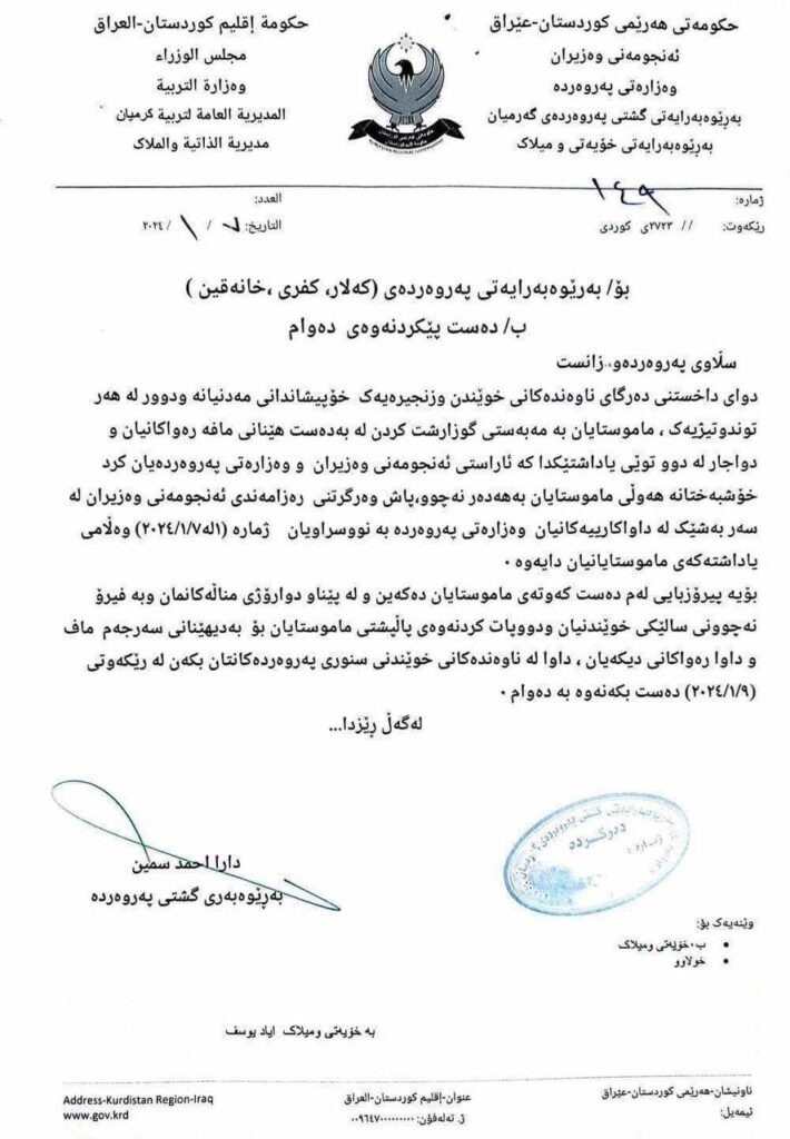 بەڕێوەبەری گشتیی پەروەردەی گەرمیان داوا لە بەڕێوەبەرایەتییەکانی پەروەردەی کەلار، کفری و خانەقین دەکات دەست بە دەوام بکەنەوە.