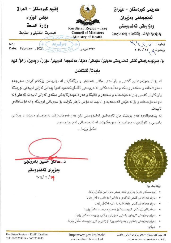وەزارەتی تەندروستیی حكوومەتی هەرێمی كوردستان، لە نووسراوێكدا كە بۆ گشت بەرێوەبەرایەتی و فەرمانگەكانی سەر بە وەزارەتەكەی ناردووە، تێیدا بڕیاری داوە: “لەپێناو بەرژەوەندیی گشتی و پاراستنی مافی نەخۆش و ڕێگریكردن لە دیاردەی ڕێكلامكردن، سەرجەم نەخۆشخانە و بنكە و مەڵبەندە تەندروستییەكان ئاگادار بكرێنەوە، كە پێدانی كارتی تایبەتی نۆڕینگە، یان كارتی كەسی لە نەخۆشخانە و سەنتەر و تاقیگە و دامەزراوەكانی كەرتی تایبەت لە ناو نەخۆشخانە بۆ نەخۆش قەدەغەیە، نابێت نەخۆش ناچار بكرێت بۆ ئەوەی سەردانی نۆڕینگە و نەخۆشخانەی تایبەت بكات.”