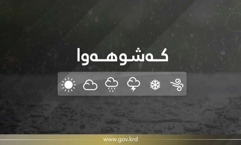 ئەمڕۆ هەینی 15/3/2024، بەشی پێشبینیی وەزارەتی گواستنەوە و گەیاندنی حكوومەتی هەرێمی كوردستان، پێشبینییەكانی كەشوهەوای 48 كاتژمێری داهاتووی بڵاو كردەوە و ئاماژەی بەوە داوە، ئەمڕۆ ئاسمان لە نێوان نیمچەهەور و هەوری تەواو دەبێت، لە کاتەکانی دوای نیوەڕۆ لە ناوچەکانی باکوور و ڕۆژهەڵاتی هەرێمی كوردستان، بە تایبەت لە ناوچە شاخاوییەکاندا، نمەباران و بارانی مامناوەند دەبارێت، لە شەویشدا ڕێژەی دابارین لە سنووری پارێزگای هەڵەبجە و سلێمانی کەمێک زیاتر دەبێت، هەندێک کات لە کاتى باران، هەورەتریشقەشى لەگەڵدا دەبێت.”