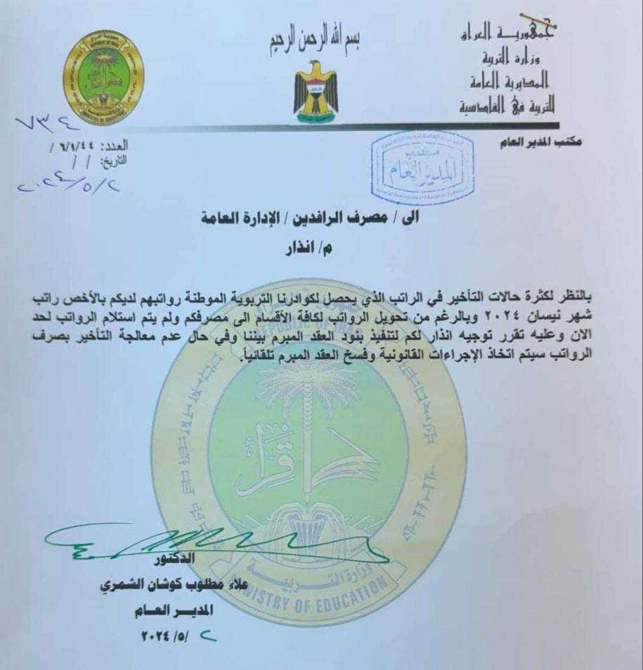 بەڕێوەبەرایەتیی گشتیی پەروەردە لە پارێزگای دیوانیە لە نووسراوێکی فەرمیدا کە دووی ئەم مانگە ئاراستەی بانکی ڕافیدەینی کردووە کە یەکێک لە بانکە سەرەکییەکانی پرۆسەی تەوتینە، هۆشداری داوە لەوەی ئەگەر کێشەکەی دواکەوتنی مووچەی فەرمانبەرانیان چارەسەر نەکرێت ئەوا گرێبەستیان لەگەڵ بانکەکە بە یەکجاری هەڵدەوەشێننەوە.