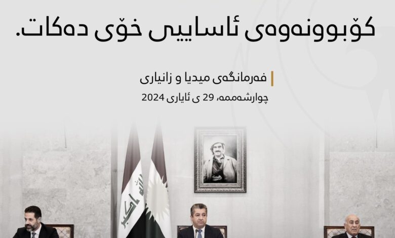 ئەمڕۆ چوارشەممە، ٢٩ـی ئایاری ٢٠٢٤، ئەنجومەنی وەزیرانی هەرێمی کوردستان، بە سەرپەرشتیی مەسرور بارزانی، سەرۆکی حکومەتی هەرێمی کوردستان و ئامادەبوونی قوباد تاڵەبانی، جێگری سەرۆكی ئەنجومەنی وەزیران، کۆ دەبێتەوە و چوار بڕگە تاووتوێ دەکات.