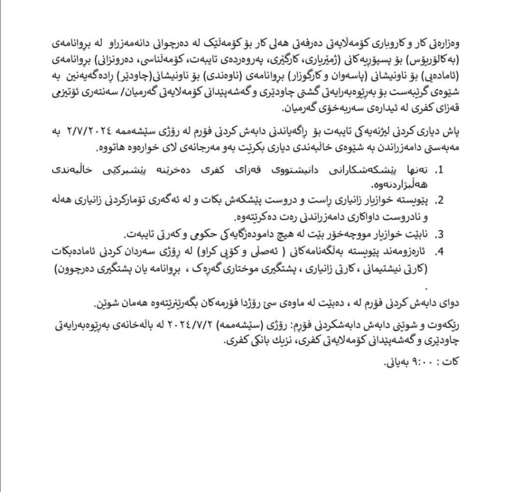 ئاماژە بەوەشدراوە، رۆژی سێشەممە 2/7/2024 لە بالەخانەی بەرێوەبەرایەتی چاودێری و گەشەپێندانی کۆمەلایەتی کفری، فۆرمی دامەزراندنەکە دابەش دەکرێت.