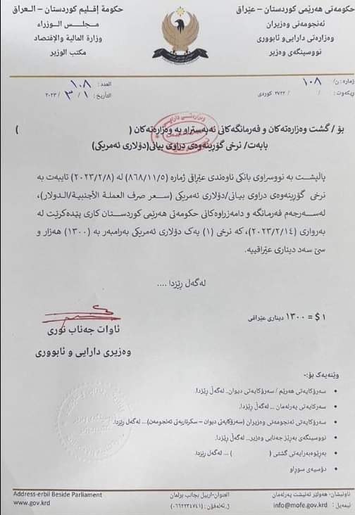 ‎به‌ گوێره‌ی نووسراوێكی وه‌زاره‌تی دارایی و ئابووریی حكوومه‌تی هه‌رێمی كوردستان، له‌ رێککەوتی 14/2/2023ەوە، لە سه‌رجه‌م فه‌رمانگه‌ و دامه‌زراوه‌ حكوومیه‌كان نرخی یه‌ك دۆلاری ئه‌مریكی به‌رامبه‌ر به‌ 1300 دیناری عێراقی ده‌بێت.