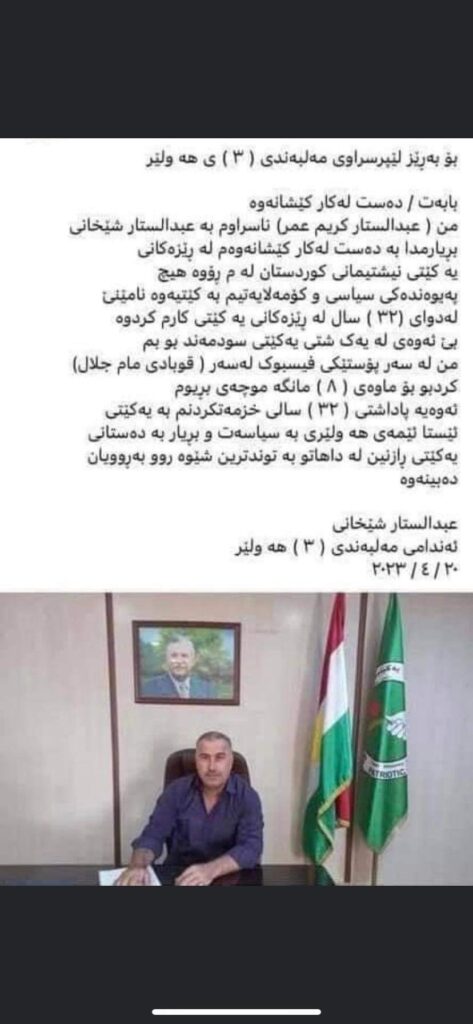 عبدلستار شێخانی ئەندامی مەلبەندی ٣ ی هەولێر، دوای پۆستێکی لەسەر قوباد تالەبانی موچەکەی دەبردرێت.