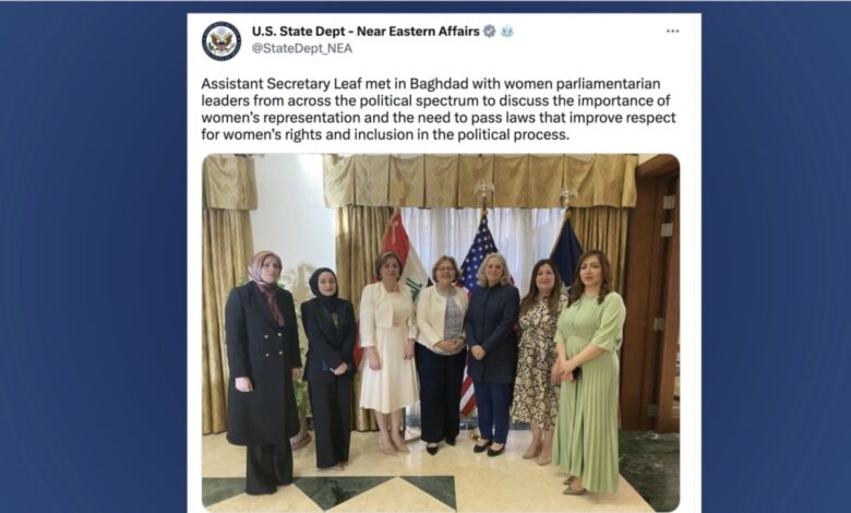 بەڵام تویتێکی پێگەی وەزارەتی دەرەوەی ئەمریکا بۆ کاروباری نزیک لە خۆرهەڵاتی ناوەڕاست، وردەكاریی ئەو كۆبوونەوەیەی بڵاو كردۆتەوە و ئاشكرای كردووە، باڕباڕە بیف، یاریدەدەری وەزیری دەرەوەی ئەمریكا لە بەغدا، لەگەڵ ژمارەیەك لە ژنە پەرلەمانتارەكانی سەر بە پێكهاتە سیاسییەكانی عێراق كۆبوونەتەوە و تێیدا باسیان لە گرنگیی نوێنەرایەتیكردنی ژن و زەروورەتی دەركردنی یاسایەك كە كار لەسەر باشتركردنی ڕێزگرتن لە مافەكانی ژنان و تێكەڵكردنی ژن بە پرۆسەی سیاسی كردووە.