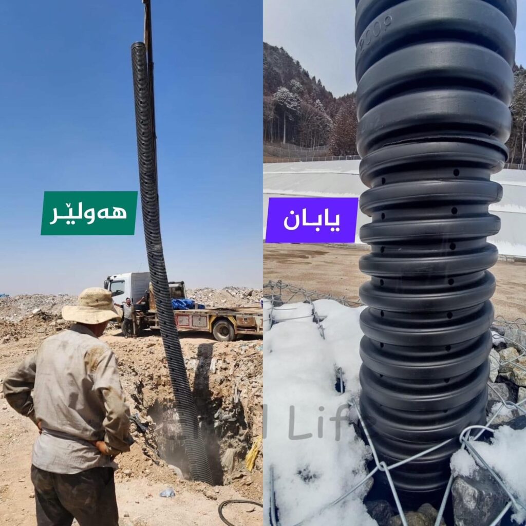 ئەندازیار ژیار جەلال بەڕێوەبەری ژینگەپارێزی هەولێر دەڵێت: “دوو ساڵ پێش ئێستا لە زبڵخانەی کانی قڕژاڵە نزیکی 70 بیر لێدرا بۆ دەرچوونی گازی قەتیسماوی ناو زبڵەکان، بۆڕی بەکارهاتوو تیایدا گەلڤەنایزی دژە ژەنگ بوو، پاش سەردانم لەگەڵ سێ ئەندازیاری تر لە وەزارەتی شارەوانی لۆ وڵاتی یابان، ئەوەی لەوێ دیتم بۆری کۆریگەیتی پلاستیکی کونکراویان بەکاردەهێنا”.